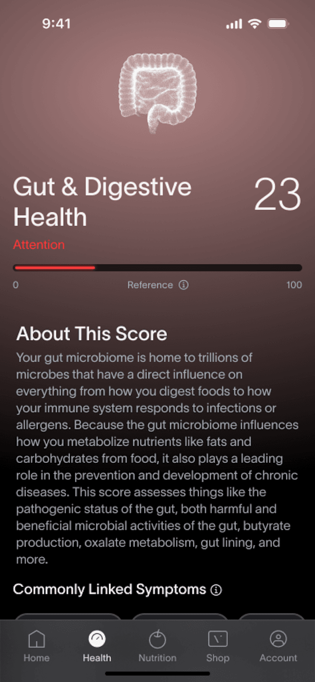 • Insights claros que relacionam o seu microbioma intestinal com a sua saúde global